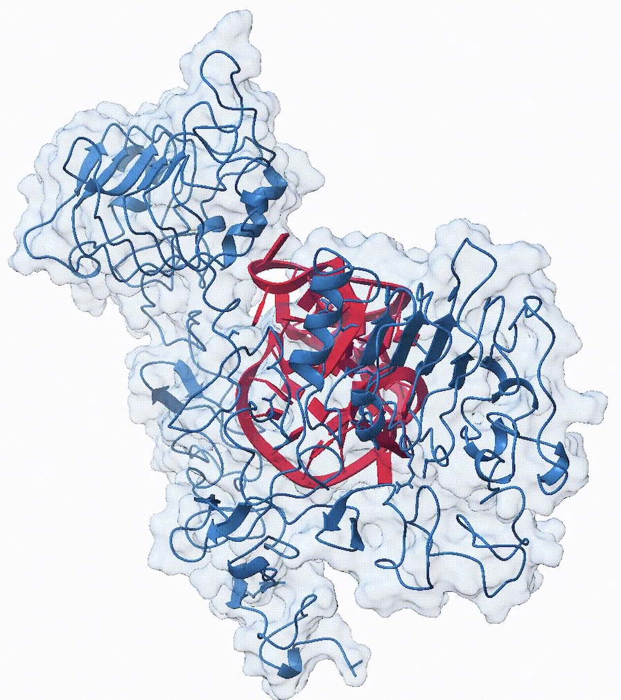 An RNA molecule (red) designed by RNA-X to bind EGFR protein (blue)
