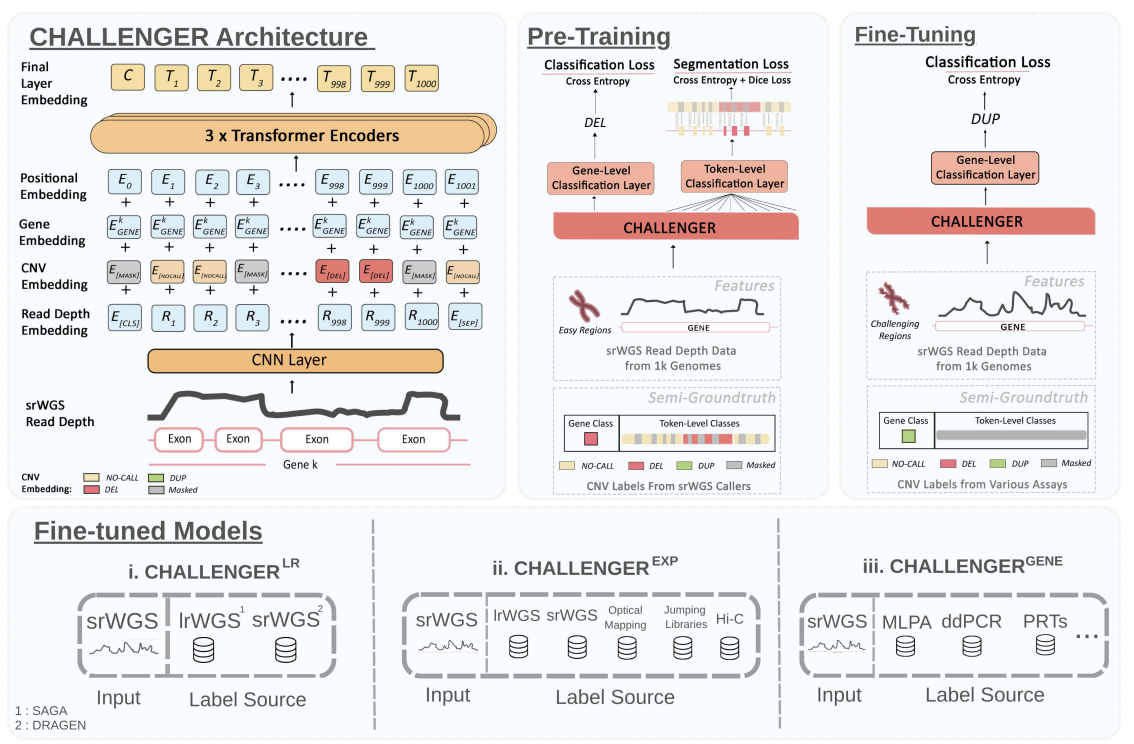 Finally, CNV detection in genomic regions that are difficult to align, such as repetitive, duplicated, or "camouflaged" areas. While long-read sequencing technologies can resolve these structural variants, their high cost often makes them impractical for large-scale clinical use. To solve this, we developed CHALLENGER, a transformer-based deep learning framework that utilizes masked language modeling to detect gene-level CNVs using only standard short-read sequencing data. CHALLENGER is uniquely trained to bridge the gap between sequencing technologies: it is first pre-trained on short-read data and then fine-tuned using high-confidence calls from long-read sequencing, human expert labeling, and experimental validation. This training regime enables the model to pinpoint variants that were previously only accessible via expensive orthogonal technologies or manual expert review. Our results show that CHALLENGER improves the state-of-the-art CNV detection F1-score by 40.8%, successfully capturing over 80% of CNVs in challenging regions that typically require long reads. Additionally, the model is specialized for complex paralog genes, such as SMN1/2 and AMY1/2, allowing for precise, paralog-specific copy number calls.