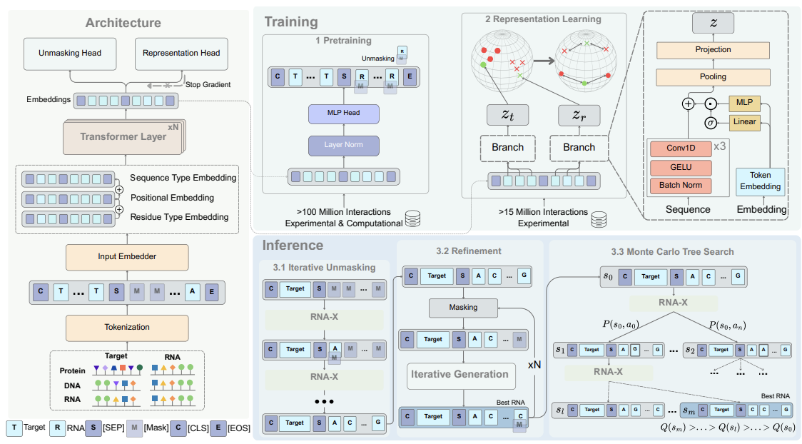 Our research lab is focused on developing the next generation of RNA foundation models to transform the landscape of therapeutic design. We address the fundamental challenge of designing RNA sequences that can selectively and strongly bind to specific target molecules—a process traditionally hindered by the vastness of the sequence space and the limitations of trial-and-error experimental methods. To solve this, we developed UTRGAN, RNAGEN, RNAtranslator, and recently RNA-X. The latest work, RNA-X is a novel interaction-aware foundation model based on masked language modeling and representation learning. Unlike previous methods restricted primarily to protein targets, our work enables the conditional design of RNA binders targeting proteins, other RNA, and DNA molecules.